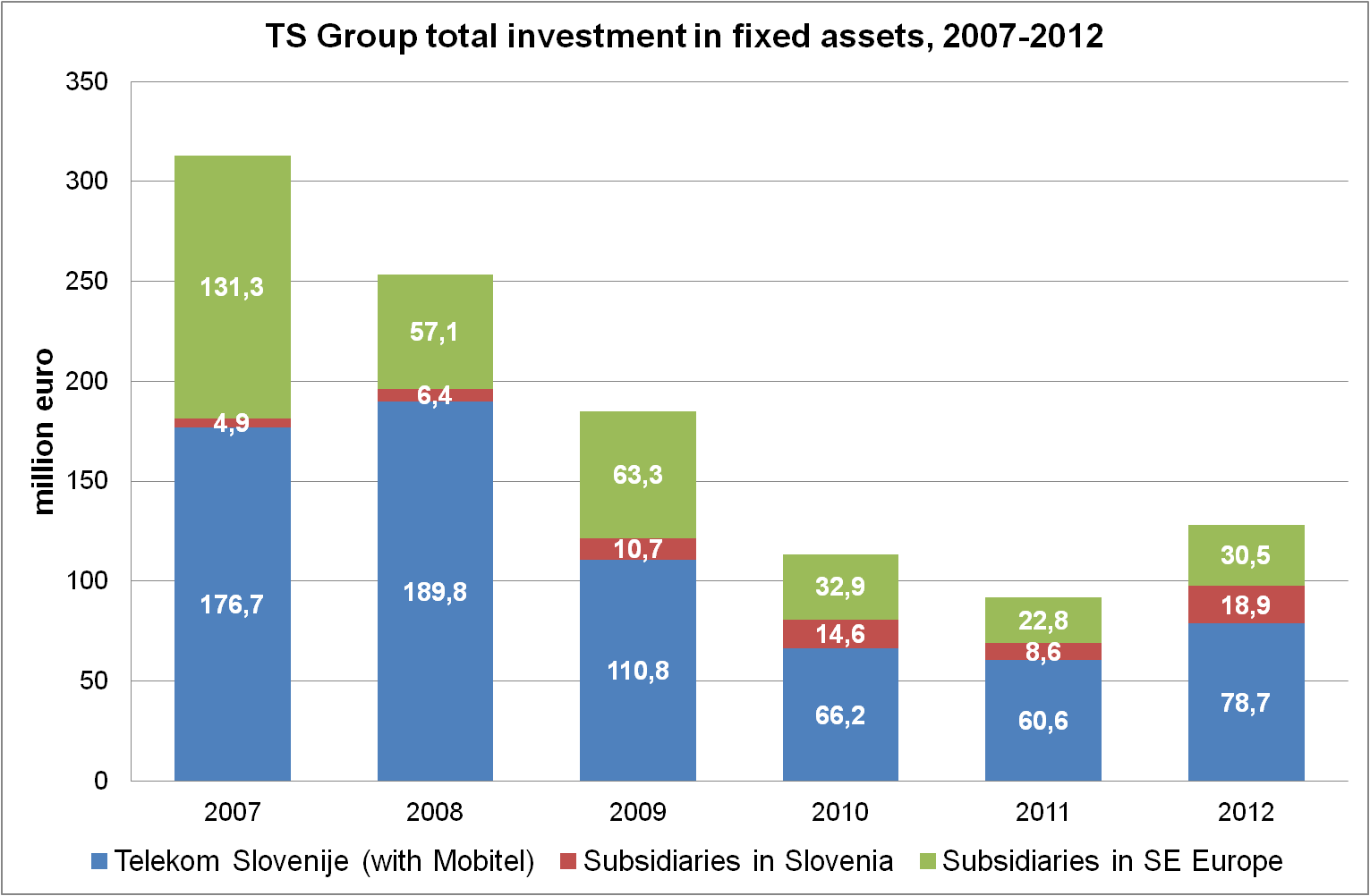 In the second half of the past decade, the TS Group had expanded its operations to the South East European markets. Desperate for expansion in the region, Telekom Slovenije had drastically overpaid its acquisitions in Albania, Bosnia and Herzegovina, Kosovo, and Macedonia. The company had also been overly generous in buying out minority shareholders (STA). Following a disclosure of irregularities, Telekom Slovenije determined the fair value of its investments in South East European subsidiaries in 2010 and recognised impairments of EUR 266 million. Further impairments of these investments were recognised in 2011 (EUR 45,4 million) and in 2012 (EUR 5,9 million). The total value of investments in subsidiaries in South Eastern Europe as of 31 December 2012 was EUR 57,8 million.